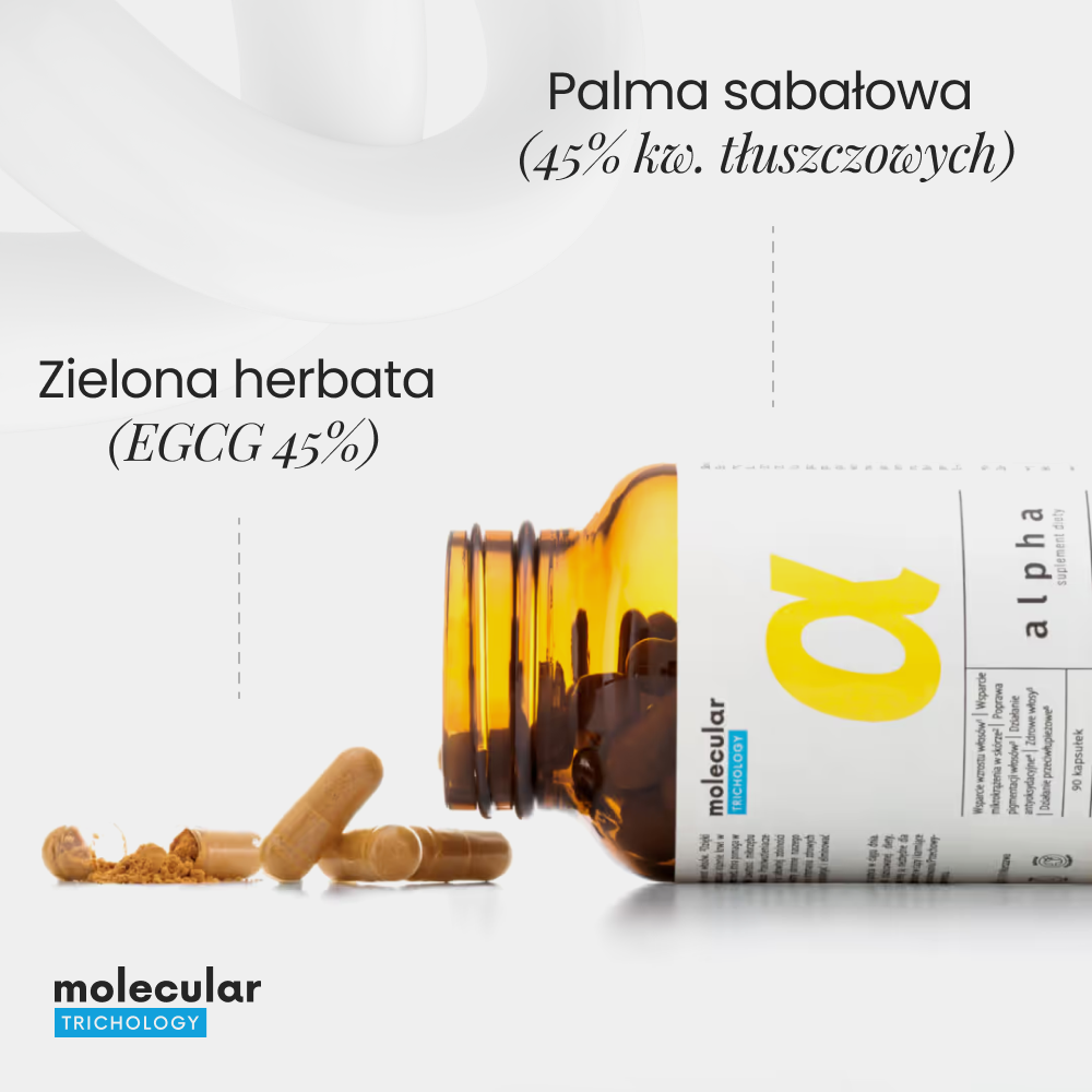 Molecular Trichology Alpha to nasza odpowiedź na łysienie androgenowe. Ten innowacyjny preparat wykorzystuje naturalne substancje o udowodnionej skuteczności, by ograniczyć nasiloną utratę włosów, wesprzeć ich wzrost i kondycję oraz zapobiegać przedwczesnemu siwieniu.
