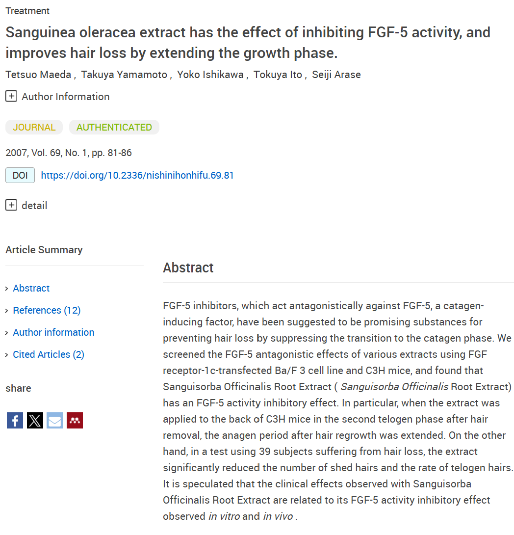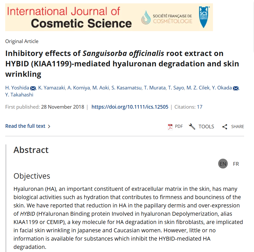 Badanie opublikowane w International Journal of Cosmetic przedstawia,że ekstrakt z korzenia Sanguisorba officinalis wykazuje zdolność hamowania degradacji kwasu hialuronowego poprzez inhibicję białka HYBID (KIAA1199). W badaniach przeprowadzonych na ludzkiej skórze twarzy zaobserwowano, że stosowanie tego ekstraktu poprawia elastyczność skóry i redukuje zmarszczki [Link do badania] Ekstrakt z Sanguisorba officinalis posiada silne działanie antyoksydacyjne, co może chronić komórki skóry przed stresem oksydacyjnym. Dodatkowo, wykazuje działanie przeciwzapalne, co może być korzystne w łagodzeniu stanów zapalnych skóry głowy. Badanie opisane w Nishinihon Journal of Dermatology sugeruję, że ekstrakt z korzenia Sanguisorba officinalis może hamować aktywność czynnika wzrostu fibroblastów 5 (FGF5), który jest związany z wypadaniem włosów. Inhibicja FGF5 może prowadzić do przedłużenia fazy anagenu (wzrostu) włosa, co potencjalnie redukuje wypadanie włosów [Linkd do badania]